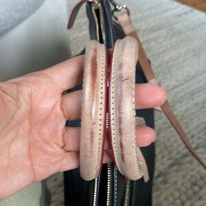 Dooney & Bourke Dillen double pocket satchel in black and light tan. This elegant bag has top handles and an adjustable/removable shoulder strap. It’s in very good. Preowned condition. There is somewhere on the top of the handles. The interior has one zippered pocket and one open pocket and clip for keys.