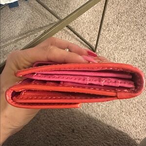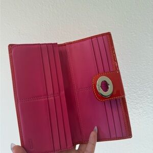Stylish red patent leather wallet. Features signature Coach logo. Secure turn-lock closure.