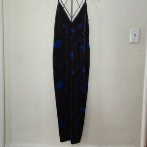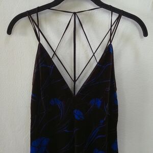 Long velvet dress with strappy back. Brown black velvet with blue floral print.