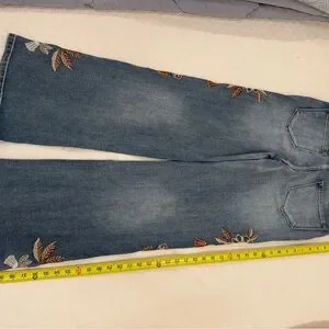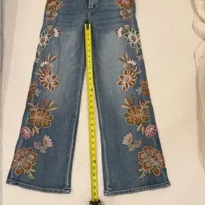 Chic wide leg jeans featuring vibrant floral embroidery. Perfect for adding a touch of elegance to your casual wardrobe.