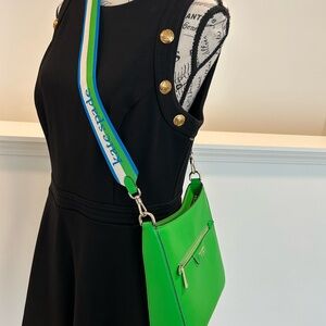 Vibrant green crossbody bag. Features a multicolor strap with blue, white, and green. Front zip pocket. Stylish and functional.