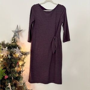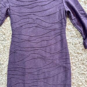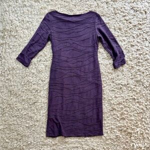 This Sharagano dress is perfect for workwear and business occasions. Also great for church worship or a night out. The knee-length, bodycon style dress features a textured pattern and 3/4 sleeves with a boat neck and pullover closure. The dress is made of stretch material and comes in a beautiful purple color. Seams placed in the bodice for a flattering slimming silhouette