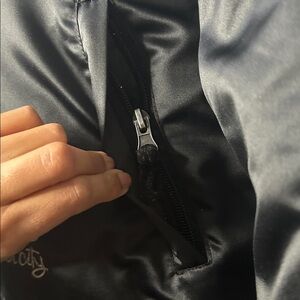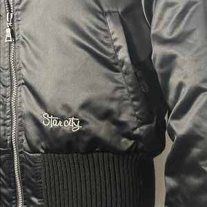 Features a front zipper, ribbed cuffs and waistband, and embroidered "Star city" detail near the hem. Size Large. Serving early 2000s Y2K vibes. Gently loved and in excellent condition.