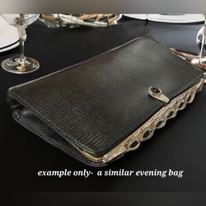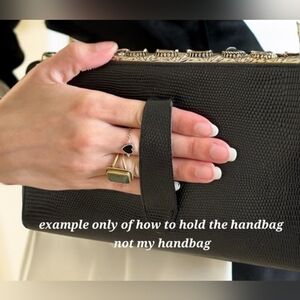 This sophisticated vintage black Berger Bags clutch features exquisite gold accents, perfect for any formal occasion. Its sleek design and luxurious details make it a must-have accessory. A rare find! Berger Bags was a Luxe brand for its time period. Likely European or US importer using a French styled name.