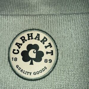 The Carhartt Beanie Hat Cap in mint green with a shamrock design is a stylish and practical accessory for outdoor work or casual wear. Made from acrylic knit fabric, this lightweight and breathable beanie features a shamrock character pattern, making it ideal for the winter season. The hat is signed by Carhartt, known for their quality workwear, and includes a logo patch for added style. Perfect for travel, outdoor activities, or simply as a cozy addition to your winter wardrobe.