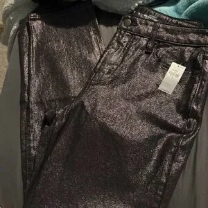 Shimmering metallic finish. Straight leg design. Classic five-pocket style. Button and zip closure.