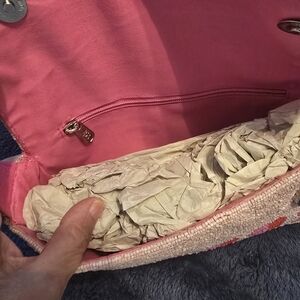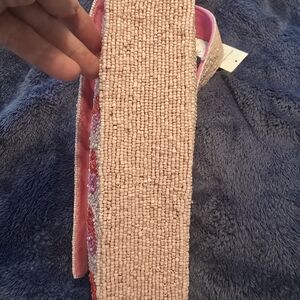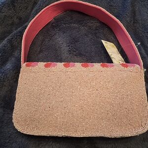 NWT....be ready for valentines day with this stunning beaded bag. A few beads missing on strap, bag comes with a bag on extra beads. Chic and stylish, this beaded bag features a charming heart pattern in pink and red. Perfect for adding a playful touch to any outfit.