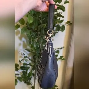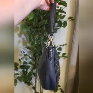 Navy leather Coach Chelsea with floral rivets. One flower missing beneath Coach logo on front. Very clean bag. Hardware is silver in color. Smoke and smell free.