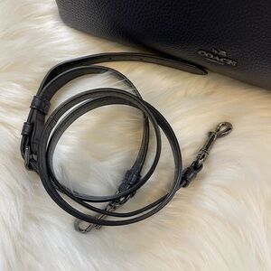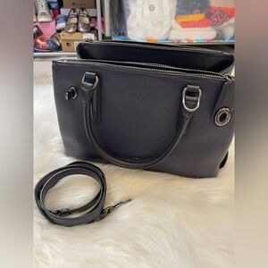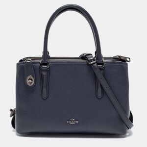 Sophisticated Coach satchel in dark blue leather. Features dual handles and a detachable strap. Perfect for everyday elegance.