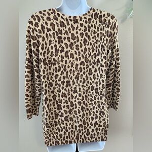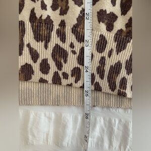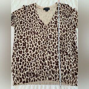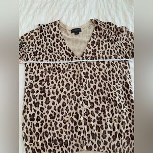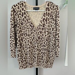 Stylish leopard print design. Perfect for layering. Soft and comfortable fabric. Sweater cardigan is a v- neck with buttons and 3/4 sleeves. Size large is 70% rayon and 30% nylon.
