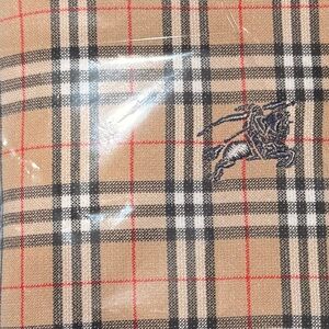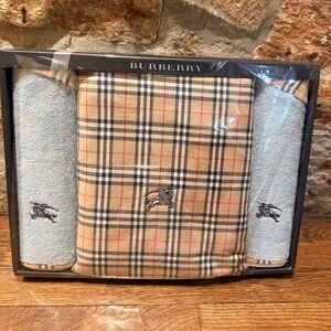 Luxurious towel set with iconic Burberry plaid. Features beige and black with red accents.