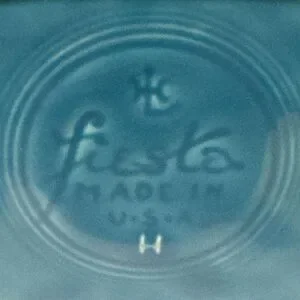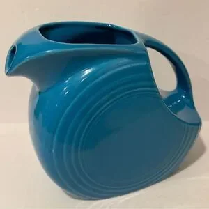 This vintage Fiesta Ware pitcher features the iconic streamlined shape and vibrant turquoise glaze that make Fiesta a timeless favorite. Perfect for serving water, juice, or cocktails, it also works beautifully as a decorative accent or vase in a kitchen or dining space. The bold color and classic design add instant mid-century charm and pair well with other Fiesta pieces or mixed serveware collections. In good pre-owned vintage condition with light wear consistent with age and normal use.
