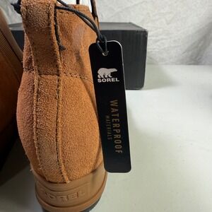 Sorel waterproof suede leather ankle boots in rich brown. These stylish boots feature a comfortable pull-on design with elastic side gores and a durable rubber sole for excellent traction. The embossed Sorel logo adds a signature touch. Perfect for everyday wear, outdoor adventures, or traveling.