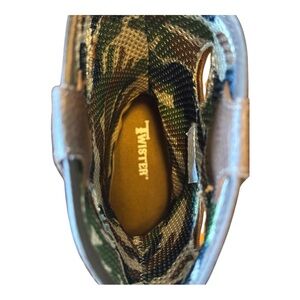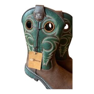 The M&F Western Twister Blaise Childrens Forest Green Boots in size 1 are stylish and durable ankle boots designed specifically for boys. With a western-inspired style and brown color, these boots are perfect for adding a touch of rugged charm to any outfit. The Twister brand ensures quality and reliability, making these boots a great choice for active kids who love the outdoors. The unique character and design of these boots make them a standout addition to any little boy's shoe collection.