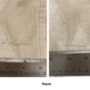 This was submitted to recycling with a defect that involved 2 cuts at back center, almost at bottom edge. This was mended by stitching cuts closed - pls see pics for before and after repair.