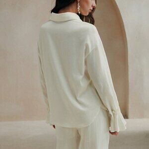 Elegant Pearl Decor Ruffle Sleeve Beige Blouse - Beige