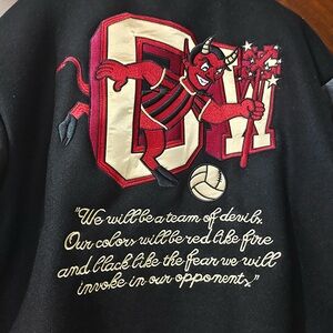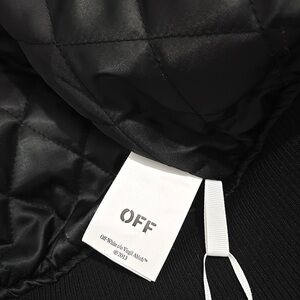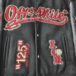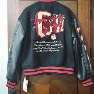 The main body is made of black wool fabric, with black leather sleeves. The ribbed collar, cuffs, and hem feature red and black stripes.