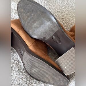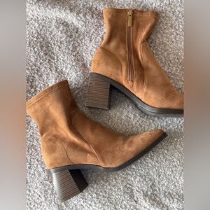 Classic and versatile Anne Klein suede ankle boots in a warm brown tone.