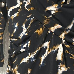 Chic top with a striking black and gold pattern. Features a flattering draped front. Ideal for stylish outings. size M. length is approximately 25”.