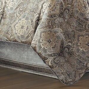 Elevate the look of your bedroom with the J. Queen New York Provence Comforter Set. This traditional design features an intricately woven chenille damask in a serene Stone color framed with a deep Chocolate color. Hand-sewn and custom cut, the generously oversized and overfilled comforter is finished with a chenille foulard piping, while two perfectly matched padded pillow shams with hidden zippers and a Stone chenille bedskirt complete the set.