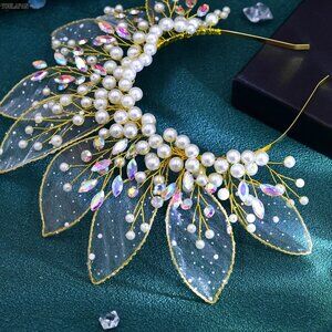 ✨✨Mesh leaf shape pearl fantasy rhinestone crown birthday headdress