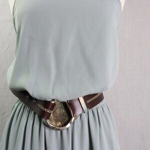 Elevate your accessories game with this stunning Post & Co designer belt, crafted in Italy from premium leather with exotic lizard inlay accents. This belt features intricate cross-stitch detailing, a substantial silver-tone O-ring buckle, and colorful snakeskin trim at the loop for a unique finish.