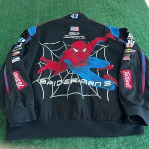 Designed for fans and collectors, this jacket offers a comfortable 3XL size fit, made from durable 100% cotton with a polyester lining for added warmth and comfort. It features a snap-button front closure, ribbed cuffs, and waistband to keep out the cold, making it suitable for transitional seasons or casual wear. The jacket carries a strong pop culture vibe with its licensed Spider-Man 3 movie graphics, perfect for NASCAR enthusiasts or Spider-Man fans seeking a unique statement piece.