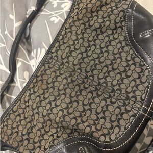 Stylish Coach shoulder bag with iconic pattern. Features tan and black design. Perfect for everyday use.
