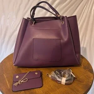 Purple leather shoulder bag with detachable crossbody strap, featuring a spacious interior with multiple pockets!! Some peeling on the handle (see pic) but crossbody strap is still in the packaging! Could probably use a wipe down on the inside but otherwise in excellent condition! 💜