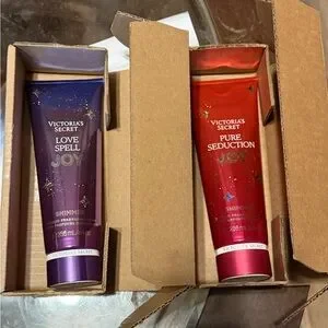 Indulge in the luxurious shimmer of Love Spell and Pure Seduction lotions. Perfect for soft, scented skin.