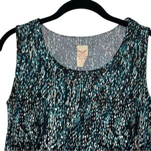 Chic and incredibly versatile sleeveless top featuring a black and blue abstract print with a subtle sheer hem detail. This is one of those pieces that works everywhere — easy casual, polished for work, or dressed up for evening.