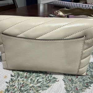 Kira Chevron Quilted Leather Chain Wallet. This elegant cream quilted wallet is perfect for any occasion. Its sleek design and sophisticated color make it a versatile accessory.