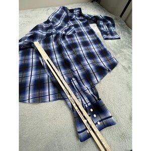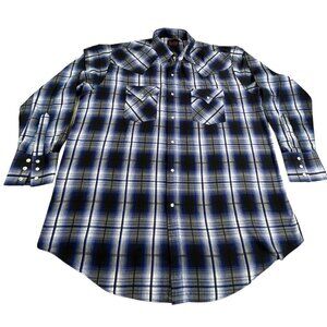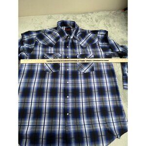 This Plains Western Wear men's XL pearl snap shirt delivers a classic cowboy look with a bold blue, black, and white plaid pattern. Features dual snap chest pockets, full pearl snap closure, and a traditional Western yoke. Lightweight and comfortable—great for rodeo, ranch work, country concerts, or everyday wear.