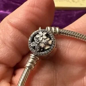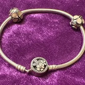 This Pandora Poetic Blooms elegant silver bracelet features 2 cherry blossom clips. All pieces are marked with the ALE S 925 stamp that authentic Pandora has. This bracelet is in new light condition. No box. Please look at the pictures and ask questions as there are no returns. I’m happy to add additional pictures and answer questions.