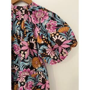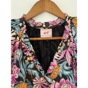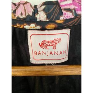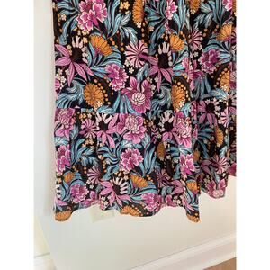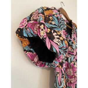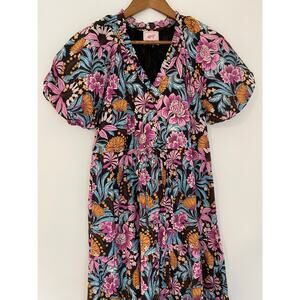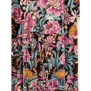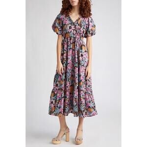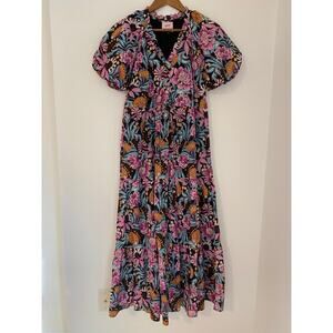 Banjanan Poppy Floral Print Organic Cotton Midi Dress Black Beauty Purple EUC
