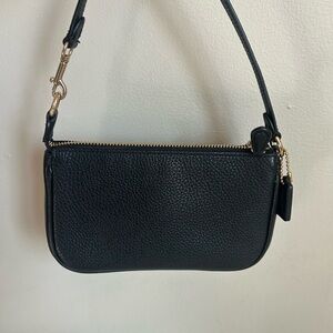 Chic and compact Coach crossbody. Pebbled leather texture. Gold-tone hardware accents. Ideal for daily use.