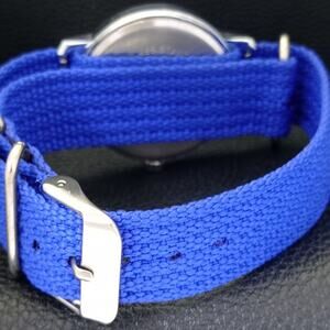 This watch has a stainless steel case in great condition with almost no flaws. The face features Silver accents on a Blue Face giving an awesome vintage look overall.