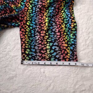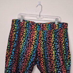 Pre-owned, good condition. No visible holes or stains. Normal signs of wear. Vibrant multicolor metallic graphic print in rainbow shades of red, orange, green, blue, purple and yellow over a black background. Pull on. Elastic high waist. Stretchy. Size per tag: 3 (3XL / XXXL). Fabric: 95% Cotton/ 5% Spandex. Size per tag does not guarantee desired fit, please see pictures for measurements.