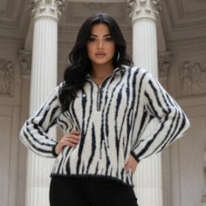 Cozy fuzzy sweater with a striking zebra print. Features a half-zip design.