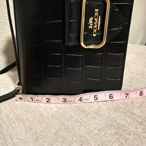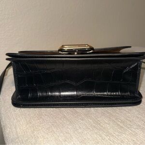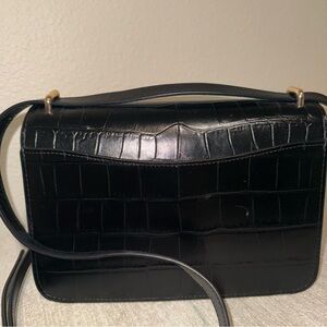 Chic black crossbody with croc-embossed leather. Features gold-tone hardware and adjustable strap. Ideal for stylish outings.
