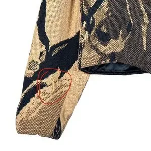 * Some visible flaws—no holes however there are a few pulls with substantial fraying on left shoulder