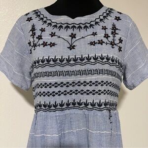 This chic blue midi dress features elegant black embroidery, perfect for any occasion. Add a touch of style to your wardrobe. 100% cotton lightweight. Beyond comfortable.