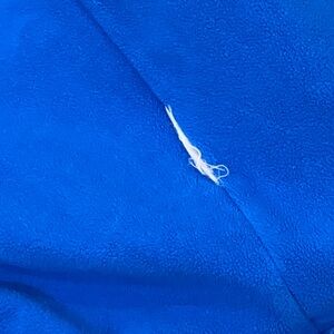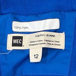Fair condition due to stains on sleeves at wrists and a spot near the pocket otherwise great condition. MEC size 12 years youth blue fall / spring coat, wind & waterproof, Zip front closure & snaps, reflectors, cozy fleece lined, zippered front pockets