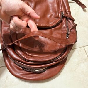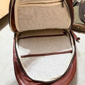 Great leather back pack with semi gloss full grain leather. TONS of pockets. You can organize everything. Only flaw is the zipper pull is missing off of the bottom pocket where the rain cover goes. Rain cover included.