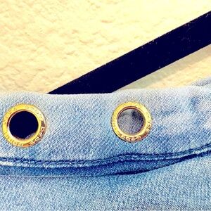 BEBE Off-Shoulder Denim Bodycon Dress – Grommet Detail – Size 6
