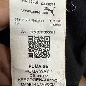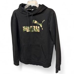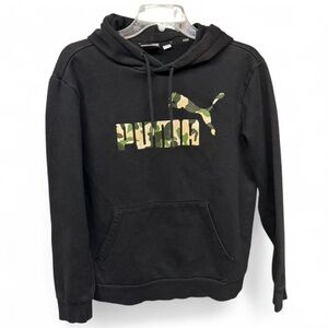 Sleek black hoodie featuring a stylish camo Puma logo. Ideal for casual wear.