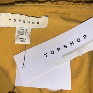 NWT Topshop Broderie Ruffle Neck Chuck It On Oversized Eyelet Dress in Mustard Yellow. Deep V in front and back, scalloped edges, ruffled neck, ruffled long sleeves, fully lined, self tie at upper back, hook & eye closures at front, beautiful eyelet detail. 100% Cotton. Size 2, 22” at armpit, 33” length. *Sold Out in Stores*