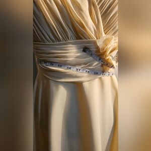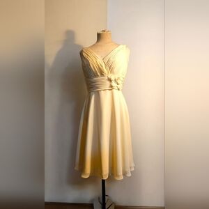 Chic cream midi dress with a flattering V-neck. Features a stylish floral accent at the waist. Ideal for any occasion.