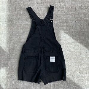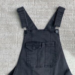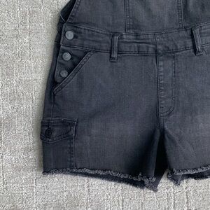 Wallflower Junior's style dark gray denim overalls, cutoff frayed hem, one cargo pocket
