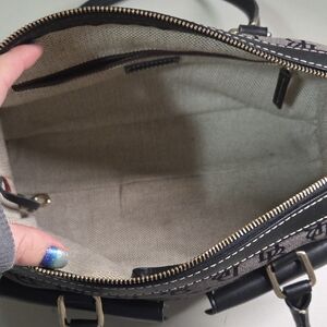 Elegant tote with iconic monogram pattern. Features black leather pockets and handles.